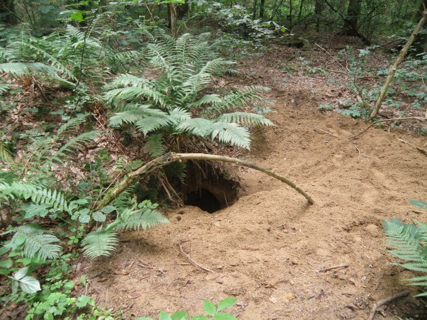Jeden z otworów wejściowych w obrębie głównego norowiska borsuka. Widoczne ślady użytkowania – niedawno wykopana gleba oraz wydeptana „rynna” prowadząca do otworu wejściowego, Kampinoski Park Narodowy (fot. B. Wiatrowska).