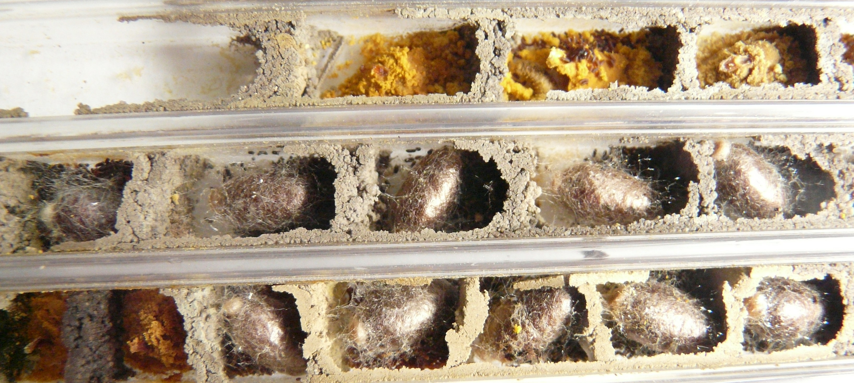P1400262 Trzy gniazda murarki w specjalnych plastikowych wytłoczkach (można o nich przeczytać w odcinku 4 (poprzednim) z serii o samotnicach). W gnieździe u góry potomstwo zamarło na etapie jaja bądź larwy, w dwóch gniazdach u dołu widoczne zimujące kokony.