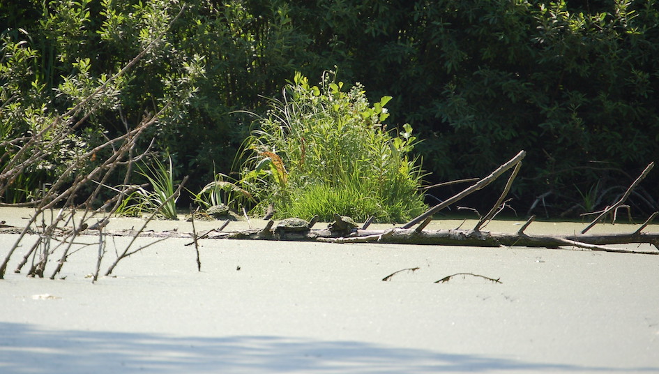 Wygrzewające się na kłodzie żółwie błotne. W środowisku naturalnym żółwia nie jest łatwo wypatrzeć; kilka wygrzewających się obok siebie osobników to wspaniały widok! Żółw błotny jest jednym z najrzadszych gadów w Polsce; w naszym kraju objęty jest ochroną gatunkową od 1935 roku. Fot. Sławomir Mitrus