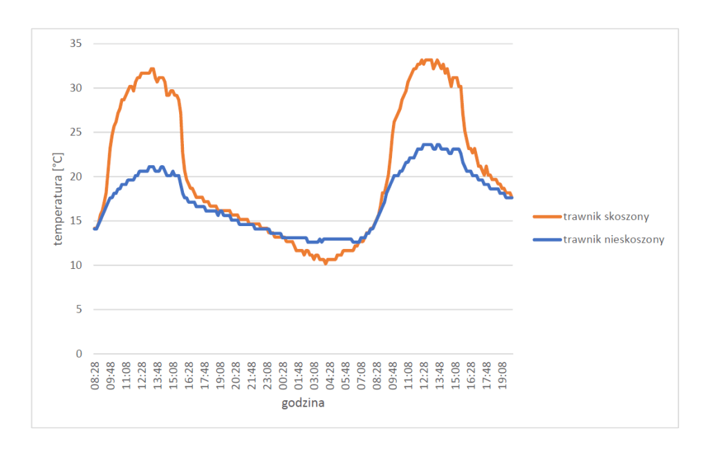 3) temperatura na trawniku skoszonym była mniej stabilna – w nocy nieco niższa niż na nieskoszonym i miała znacznie większą amplitudę.
