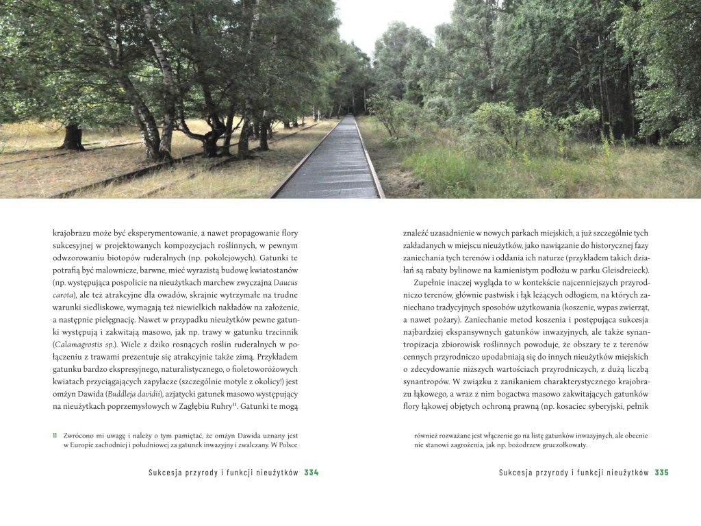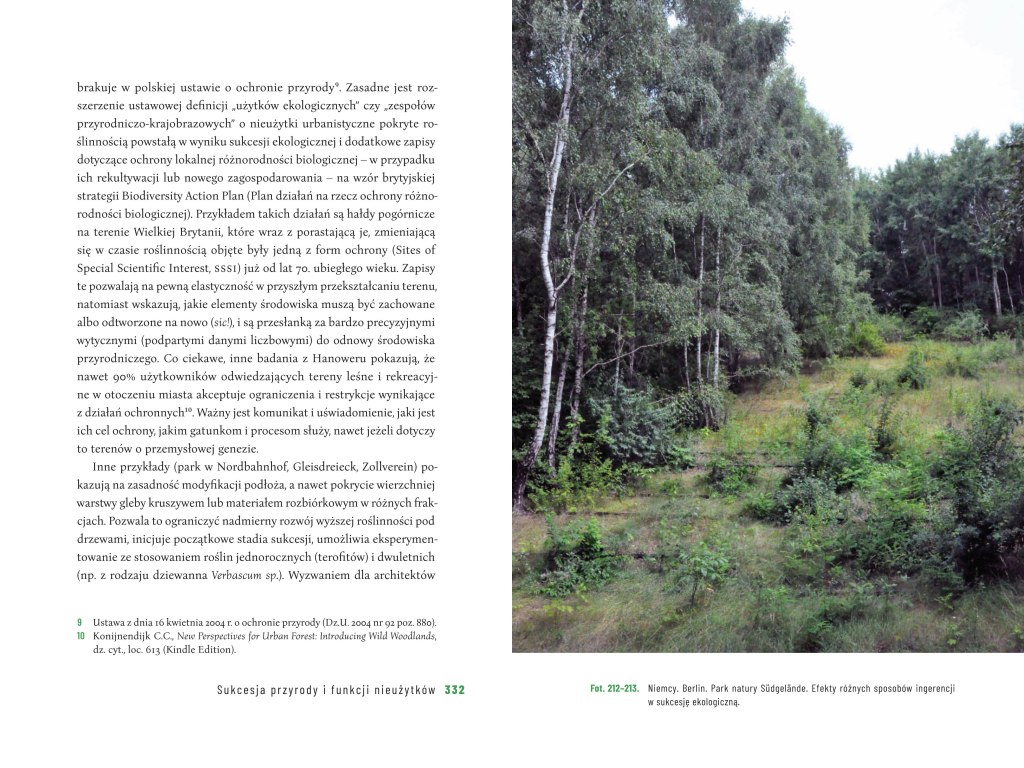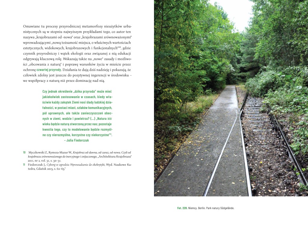 Kasper Jakubowski pokazuje przykłady z europejskich miast, głównie z Wielkiej Brytanii, Niemiec, Francji, w których udało się ochronić i wykorzystać potencjał nieużytków i dzikiej przyrody. To książka pełna praktycznych rozwiązań, przykładów ze świata, w jaki sposób chronić naturę i włączać ją do spektrum zieleni miejskiej, z korzyścią dla miasta i społeczności. To zbiór inspiracji dla władz miejskich, działaczy, samorządowców, architektów zieleni, pasjonatów miejskiej przyrody, dziennikarzy, studentów, organizacji pozarządowych. To książka o innym podejściu do przyrody w mieście, bez niszczenia jej wartości i unikalności oraz o tkwiącym w niej ogromnym potencjale.