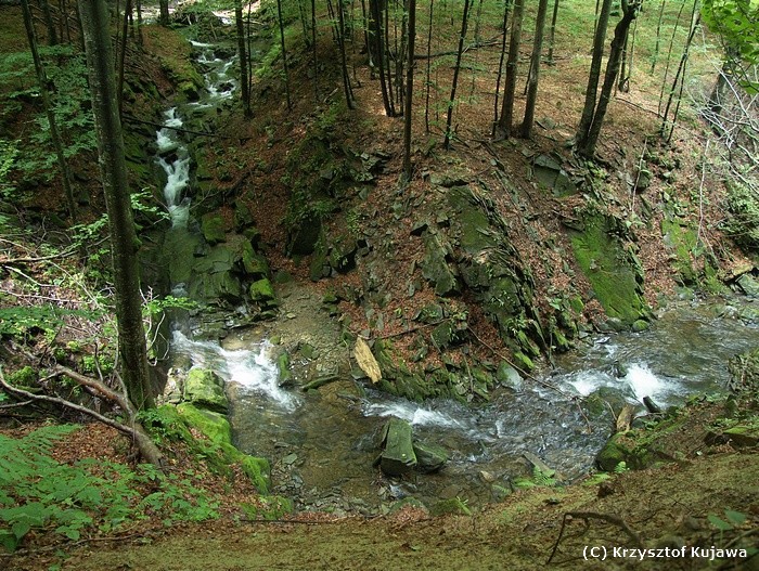 Droga zrywkowa do wywozu wyciętych starodrzewi w nadleśnictwie Lutowiska (oddział 31) w Bieszczadach, poprowadzona przez potok. Fot. Michał Książek.