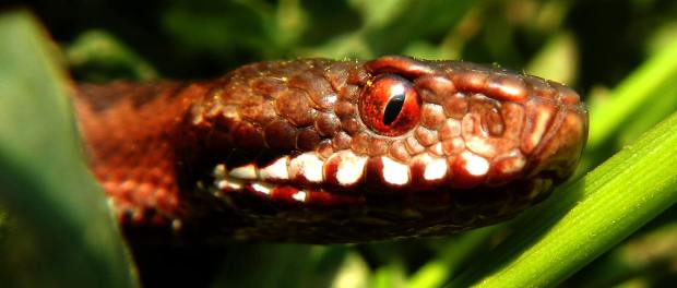 Charakterystyczną cechą żmii jest nie tylko zygzak, ale też czerwona lub pomarańczowa tęczówka i pionowa źrenica. fot. Stanisław Bury