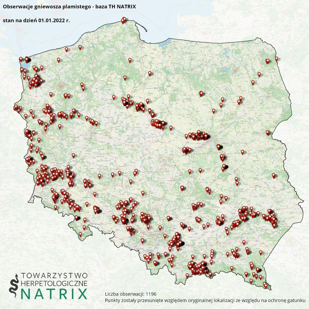 Gniewosz plamisty jest nie tylko uznawany za gatunek rzadki, ale także słabo rozpoznany. Na przełomie XX i XXI wieku znanych było zaledwie kilkanaście stanowisk, których liczebność przekraczała 10 osobników, z kolei liczba dużych pól atlasowych, w których stwierdzono obecność gatunku stanowiła zaledwie 111 spośród 290 (uwzględniając też pola pokryte przez dane zebrane do roku 1950) (Profus i Sura 2003). W 2016 roku Towarzystwo Herpetologiczne NATRIX rozpoczęło projekt gromadzenia danych na temat występowania gniewosza plamistego w Polsce, oparty głównie o tzw. naukę obywatelską (ang. citizen science). W ciągu pięciu lat trwania projektu zebrano informacje na temat 1196 obserwacji gniewosza zlokalizowanych nierównomiernie na terenie kraju (stan na 01.01.2022 r.) (Ryc. 1). Na podstawie posiadanych danych prezentujemy najważniejsze wnioski dotyczące aktualnego stanu populacji gatunku w Polsce oraz jego statusu ochronnego.
