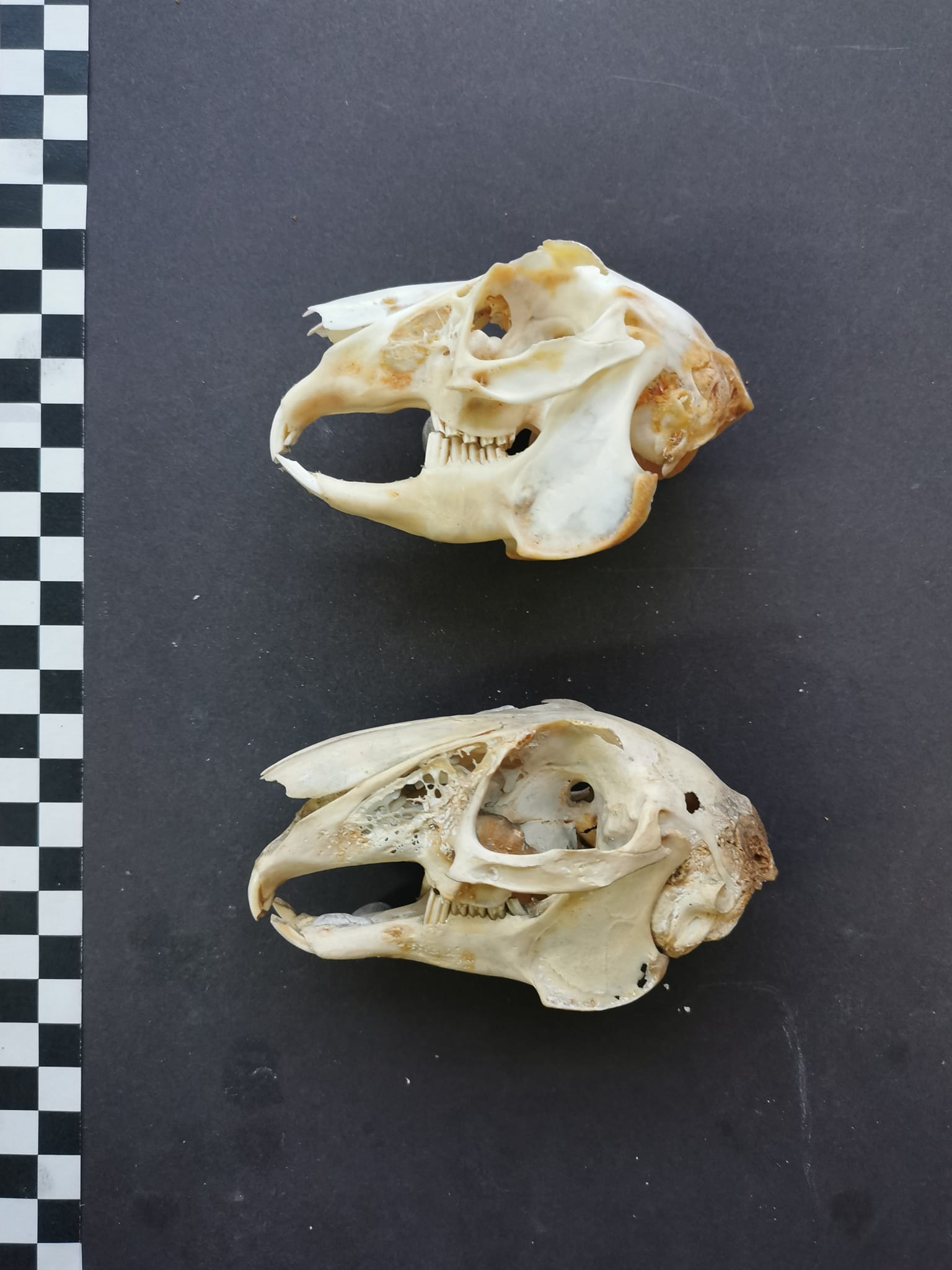 Porównanie czaszki zająca bielaka (góra) i zająca szaraka (dół), czyli dwóch gatunków zajęcy, które można spotkać w Polsce.