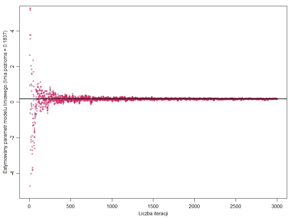 Taka „hodowla” parametrów, startująca od zróżnicowania na poziomie -100;+100, po kilkuset „pokoleniach” generuje populację parametrów bardzo zbliżonych do rzeczywistego, zawierającą się w przedziale mniej więcej 0.15 do 0.20; ze średnią 0.1829 (przypomnę, prawdziwy to 0.1837). Kolejne kilka tysięcy iteracji zawęża zmienność do przedziału 0.178; 0.186. Zatem praktycznie znaleźliśmy szukany parametr bez użycia wzorów, bazując wyłącznie na mechanizmach ewolucyjnych i komputerowych symulacjach. Ewolucja działa, również tu! Rycina obrazuje parametry wyhodowane w kolejnych pokoleniach (iteracje).