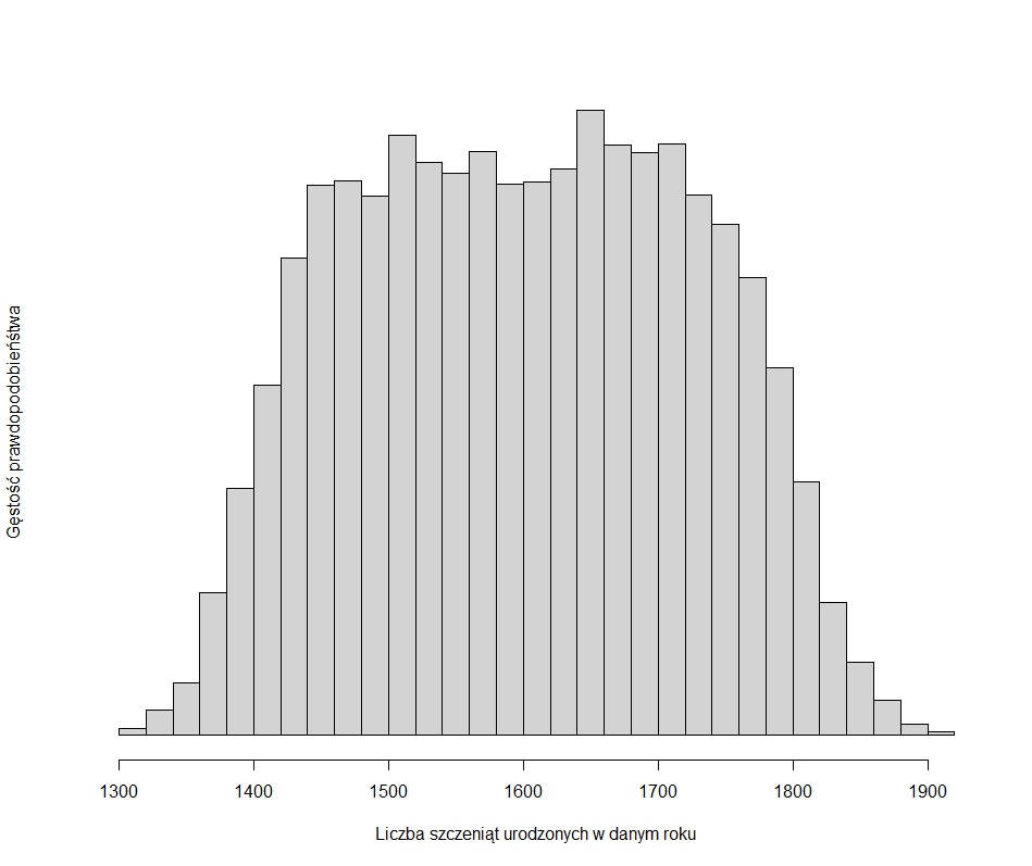 Zakładając, że co roku przystępuje do rozrodu od 350 do 450 wilczych par (przecież nie zawsze tyle samo; te pary nieustannie tworzą się i rozpadają), a liczba szczeniąt też nie jest zawsze taka sama, lecz ma, na przykład, rozkład Poissona ze średnią (lambdą) 4, oczekiwana liczba szczeniąt, która przychodzi na świat może wahać się znacznie w skali całej populacji (wykres).