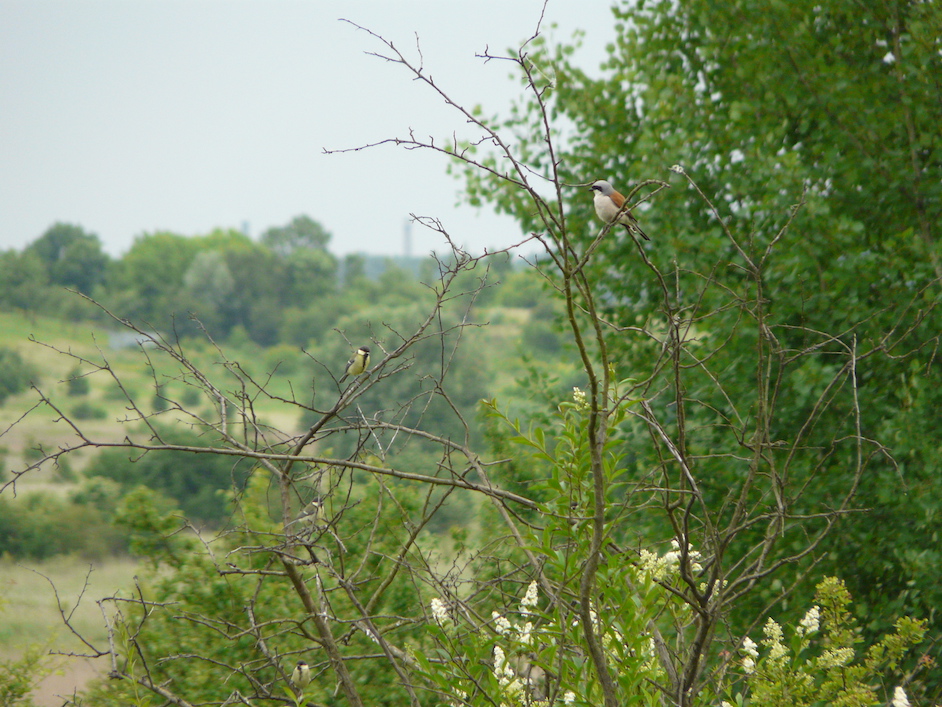 P1370461 Łąki w Kostrzu (Kraków). Na gałęziach siedzą sikory bogatki i dzierzba gąsiorek. Fot. Justyna Kierat.